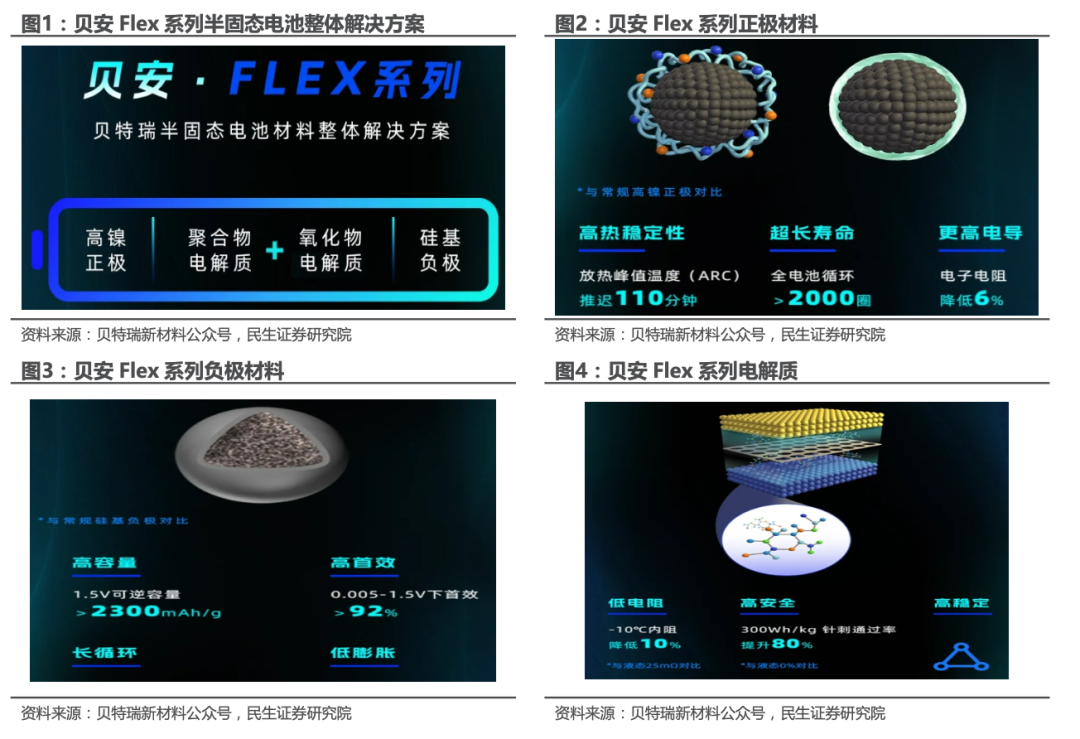 5月13日,全球电池负极材料龙头贝特瑞举办“未来能量引擎”固态电池材料整体解决方案发布会,正式发布其针对固态电池的材料整体解决方案,标志着公司在下一代电池技术领域迈出关键一步。贝特瑞为固态电池做了全面的材料布局,开发出贝安FLEX半固态及GUARD全固态系列高镍正极、硅基负极、固态电解质、锂碳复合负极等材料,通过材料创新与技术迭代支撑固态电池商业化进程,为下一代电池技术提供"高能量+高安全"的材料解决方案。
