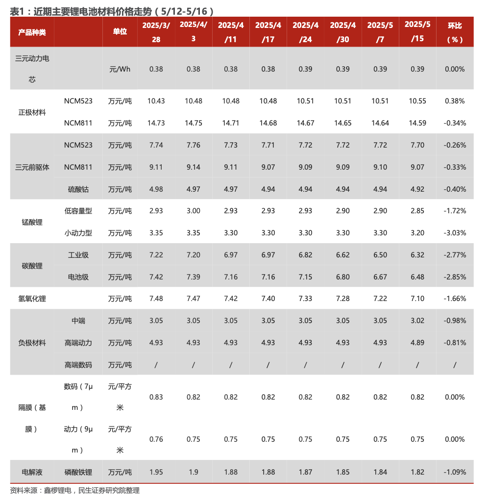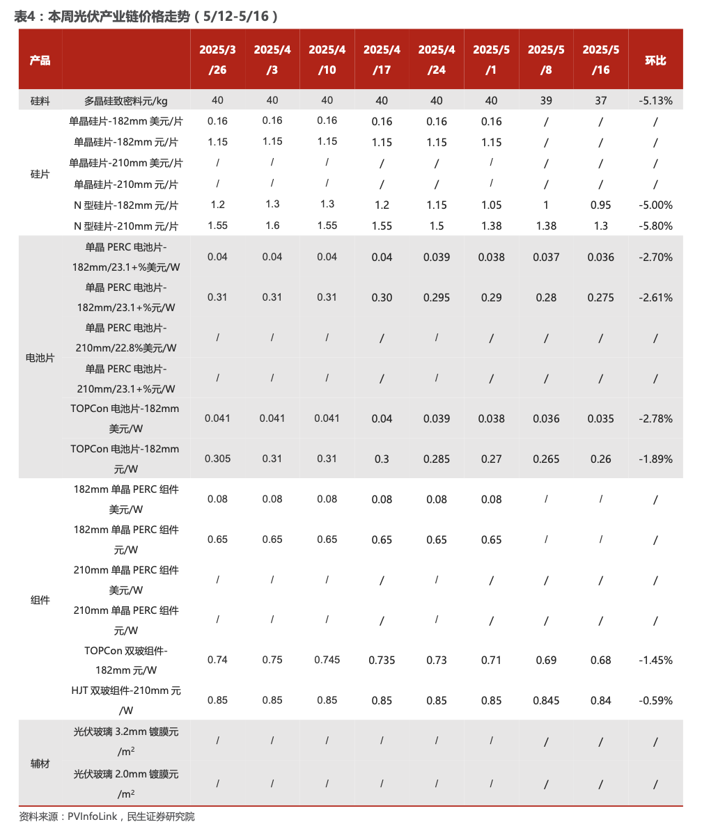 组件:根据Infolink统计,五月需求上旬仍有前期遗留项目拉动为主。直至 7-8 月可能都是较为低迷的状态,因此在当前状态之下,部分厂家商谈多有赠送让价条款,TOPCon 新单实际价格走价已经来到 0.65-0.66 元/W,甚至部分中小厂家给出价格较低廉处于低价部分 0.63-0.65 元/W,但前期主流交付价格主要仍在 0.68-0.70 元/W。182双玻PERC报价0.6-0.70元/W,HJT 0.72-0.85元/W,N-TBC 0.7-0.8元/W。海外市场稳定:TOPCon 0.085-0.095美元,HJT 0.095-0.12美元,PERC 0.07-0.08美元,N-TBC 0.1-0.11美元。亚太TOPCon价格约0.085-0.09美元,印度本地组件0.14-0.15美元;欧洲0.085-0.09美元;拉美0.08-0.085美元;中东0.085-0.09美元。美国市场受政策影响,东南亚组件上涨至0.27-0.30美元,本土TOPCon报价涨至0.4美元。