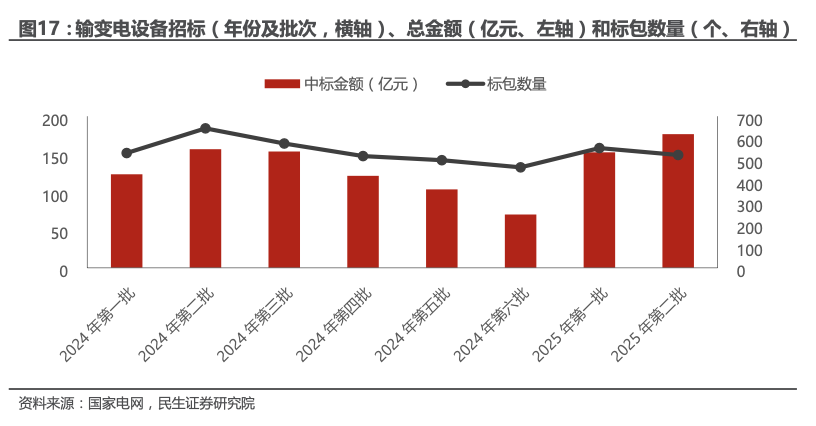 近期,国家电网2025年输变电第二次变电设备公布推荐中标候选人,公示金额176.36亿元,其中,中标标包521个,单包均值3385万元,最大标包31600万元。分标来看,组合电器41.33亿元,电力电缆25.24亿元,变压器41.29亿元,开关柜17.04亿元,继电保护和变电站计算机监控系统15.20亿元,电力电缆16.47亿元。