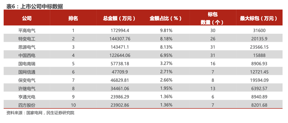 从上市公司的中标数据来看,平高电气中标17.30亿元,总金额排名第一,占比9.81%;特变电工中标14.43亿元,排名第二,占比8.18%;思源电气中标14.35亿元、中国西电中标12.26亿元、国电南瑞中标5.77亿元、许继电气中标3.45亿元。